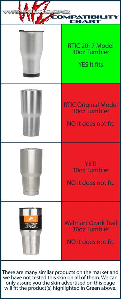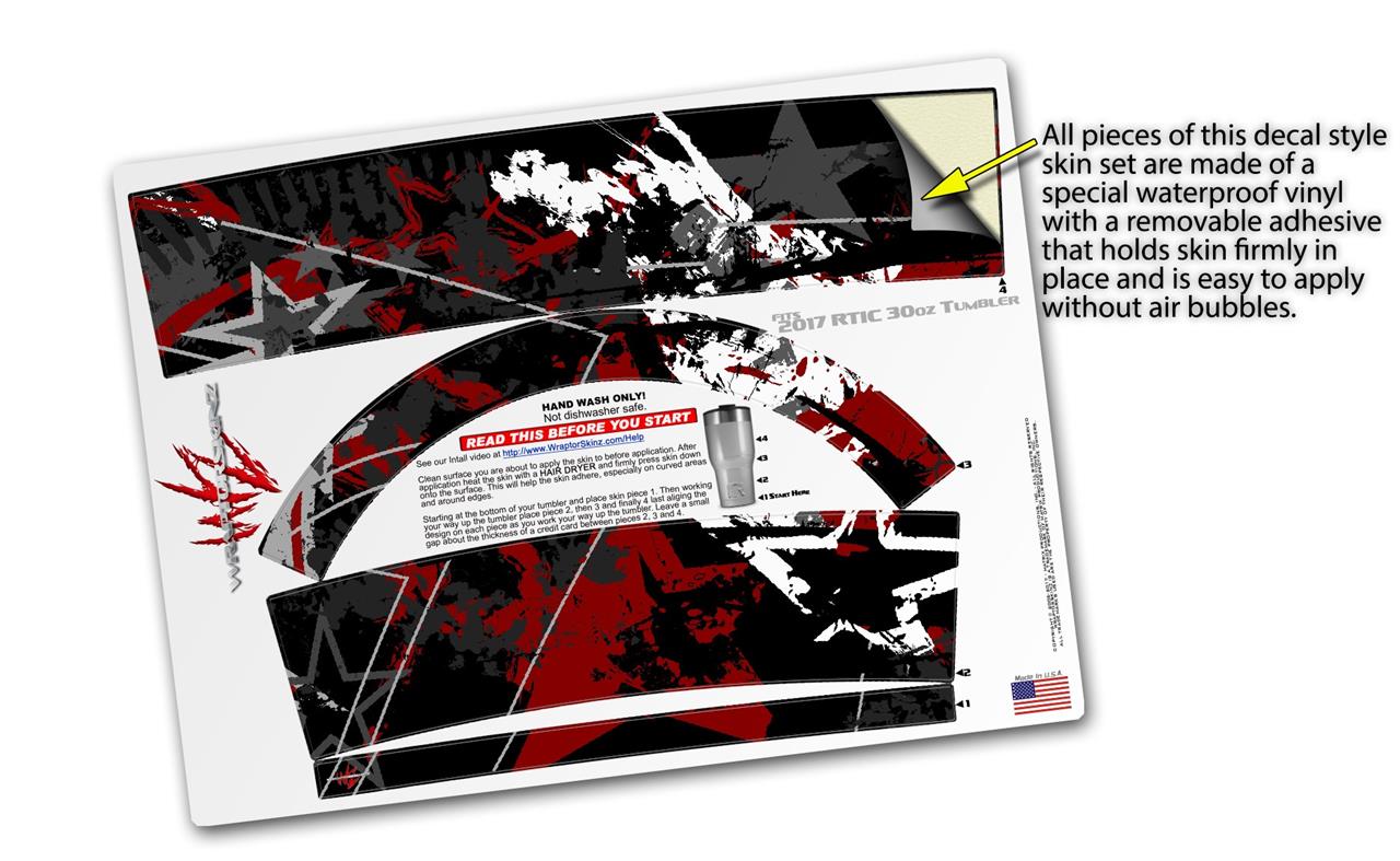 WraptorSkinz® skin wraps for 2017 RTIC Tumblers are printed using superb photo quality designs and vibrant colors printed with special fade resistant inks that last even in direct sun for years. WraptorSkinz® are a composite of two layers of commercial grade materials. The bottom layer is a soft, flexible vinyl with a special removable adhesive that is easily positioned, applied without air bubbles. Next we print the bottom layer with UV protected, fade resistant inks that deliver superb photo quality designs in vibrant colors. Finally we bond a professional grade laminate over the entire skin adding a glossy protective finish.