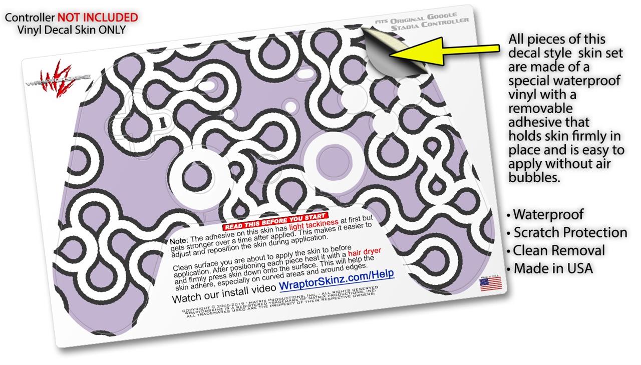 This product is in no way affiliated with or endorsed by Google. WraptorSkinz® skin wraps work with the Original Google Stadia version 1 Controller. Printed using superb photo quality designs and vibrant colors printed with special fade resistant inks that last even in direct sun for years. WraptorSkinz are a composite of two layers of commercial grade materials. The bottom layer is a soft, flexible vinyl with a special removable adhesive that is easily positioned, applied without air bubbles. Next, we print the bottom layer with UV protected, fade resistant inks that deliver superb photo quality designs in vibrant colors. Finally, we bond a professional grade laminate over the entire skin adding a glossy protective finish.