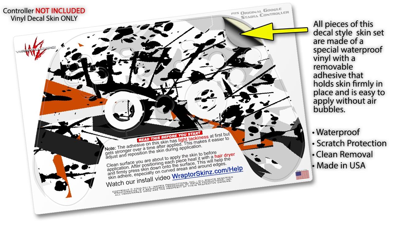 This product is in no way affiliated with or endorsed by Google. WraptorSkinz® skin wraps work with the Original Google Stadia version 1 Controller. Printed using superb photo quality designs and vibrant colors printed with special fade resistant inks that last even in direct sun for years. WraptorSkinz are a composite of two layers of commercial grade materials. The bottom layer is a soft, flexible vinyl with a special removable adhesive that is easily positioned, applied without air bubbles. Next, we print the bottom layer with UV protected, fade resistant inks that deliver superb photo quality designs in vibrant colors. Finally, we bond a professional grade laminate over the entire skin adding a glossy protective finish.