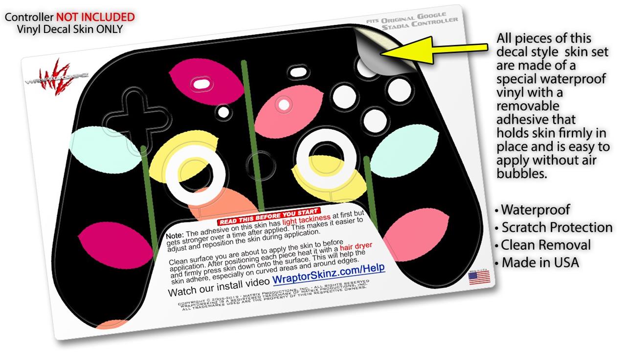 This product is in no way affiliated with or endorsed by Google. WraptorSkinz® skin wraps work with the Original Google Stadia version 1 Controller. Printed using superb photo quality designs and vibrant colors printed with special fade resistant inks that last even in direct sun for years. WraptorSkinz are a composite of two layers of commercial grade materials. The bottom layer is a soft, flexible vinyl with a special removable adhesive that is easily positioned, applied without air bubbles. Next, we print the bottom layer with UV protected, fade resistant inks that deliver superb photo quality designs in vibrant colors. Finally, we bond a professional grade laminate over the entire skin adding a glossy protective finish.
