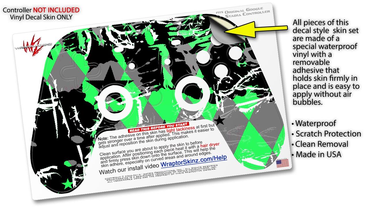 This product is in no way affiliated with or endorsed by Google. WraptorSkinz® skin wraps work with the Original Google Stadia version 1 Controller. Printed using superb photo quality designs and vibrant colors printed with special fade resistant inks that last even in direct sun for years. WraptorSkinz are a composite of two layers of commercial grade materials. The bottom layer is a soft, flexible vinyl with a special removable adhesive that is easily positioned, applied without air bubbles. Next, we print the bottom layer with UV protected, fade resistant inks that deliver superb photo quality designs in vibrant colors. Finally, we bond a professional grade laminate over the entire skin adding a glossy protective finish.