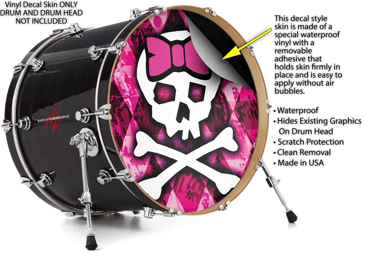 This design also available in other sizes. WraptorSkinz® skin wraps compatible with most kick drum heads. Printed using superb photo quality designs and vibrant colors printed with special fade resistant inks that last even in direct sun for years. WraptorSkinz are a composite three layer commercial grade materials vinyl. The bottom layer is a air release, grey block out removable adhesive that hides existing graphics on the drum head and is easily applied without air bubbles. The middle layer is a flexible vinyl printed with UV protected, fade resistant inks that deliver superb photo quality designs in vibrant colors. Finally, we bond a professional grade laminate over the entire skin adding a glossy protective finish.