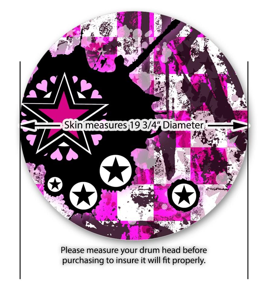 This design also available in other sizes. WraptorSkinz® skin wraps compatible with most kick drum heads. Printed using superb photo quality designs and vibrant colors printed with special fade resistant inks that last even in direct sun for years. WraptorSkinz are a composite three layer commercial grade materials vinyl. The bottom layer is a air release, grey block out removable adhesive that hides existing graphics on the drum head and is easily applied without air bubbles. The middle layer is a flexible vinyl printed with UV protected, fade resistant inks that deliver superb photo quality designs in vibrant colors. Finally, we bond a professional grade laminate over the entire skin adding a glossy protective finish.
