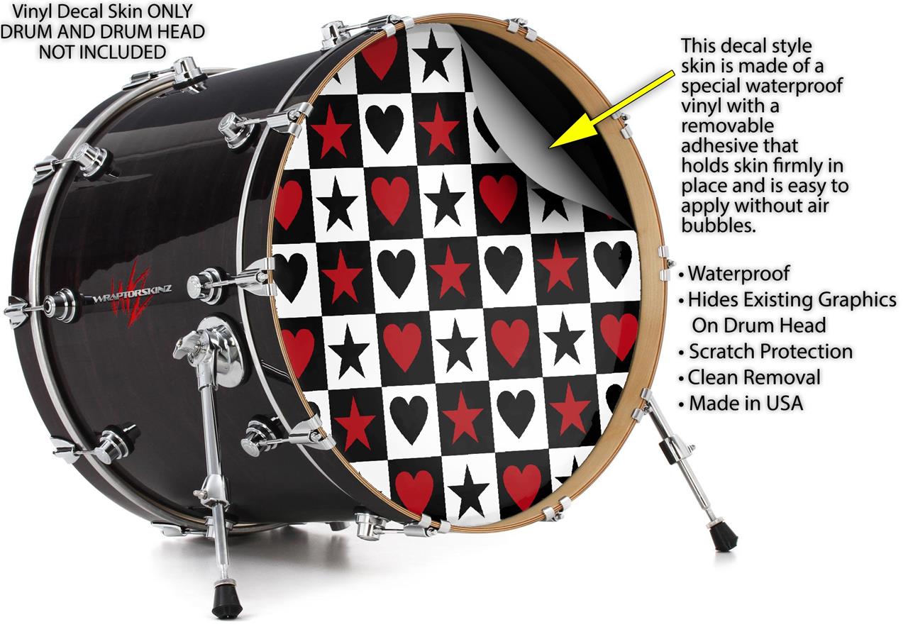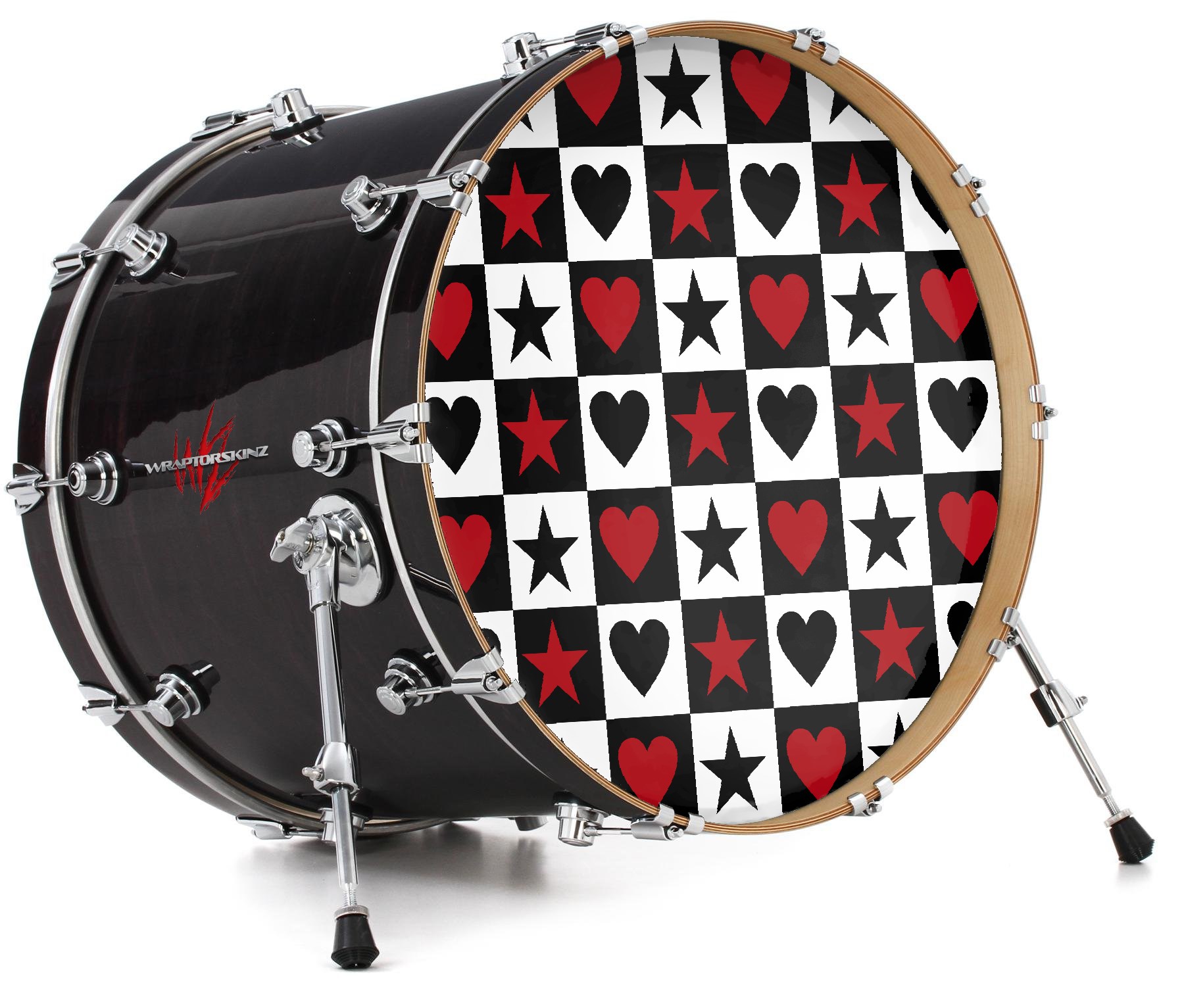 Decal Skin works with most 26" Bass Kick Drum Heads Hearts and Stars Red - DRUM HEAD NOT INCLUDED