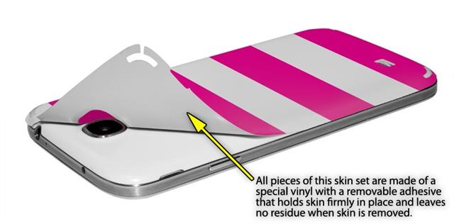 • Decal style vinyl skin covers front and back of Samsung Galaxy S4 phone.
