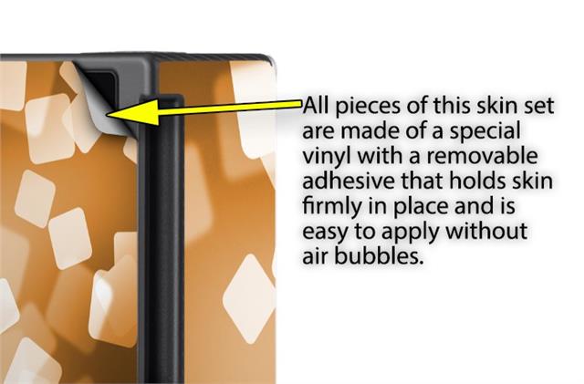 WraptoSkinz™ skins are superb photo quality designs and vibrant colors printed with special Eco-Friendly, fade resistant inks. Our skins are self-adhering flexible vinyl skins that helps prevent scratches. Made of composite, multi-layered commercial grade materials. The bottom layer is made with a special removable adhesive that is easily positioned and applied without air bubbles. We print your design on the bottom layer then bond a professional grade laminate over the entire skin adding a glossy protective finish.